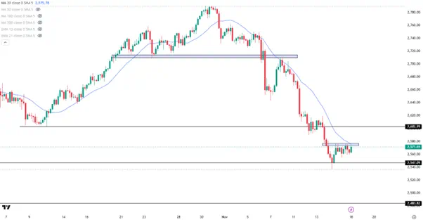 金价不仅周线三连跌,日线级别更是连续六天下行,不过跌幅在周五有所收窄,并在2540附近出现一些止跌迹象。